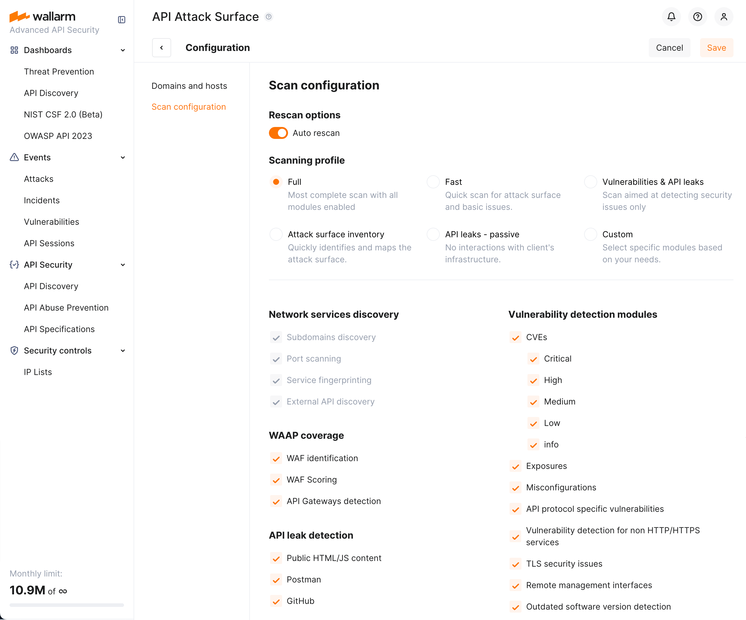 | Fast | Quick scan for attack surface and basic issues allowing to exclude external API discovery, excluding public HTML/JS content from API leak search, and limiting vulnerability detection modules. |