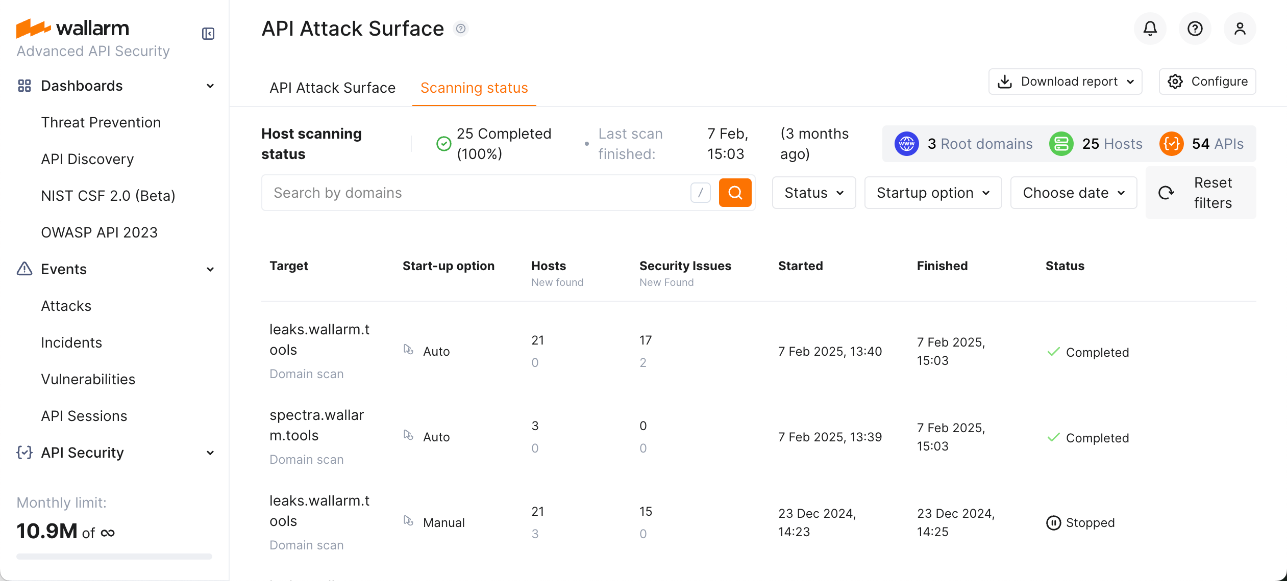 Navigate back from configuration dialog to the main API Attack Surface screen, here you can see the Host scanning status summary, then switch to Scanning status tab to see a detailed history of all scans including: