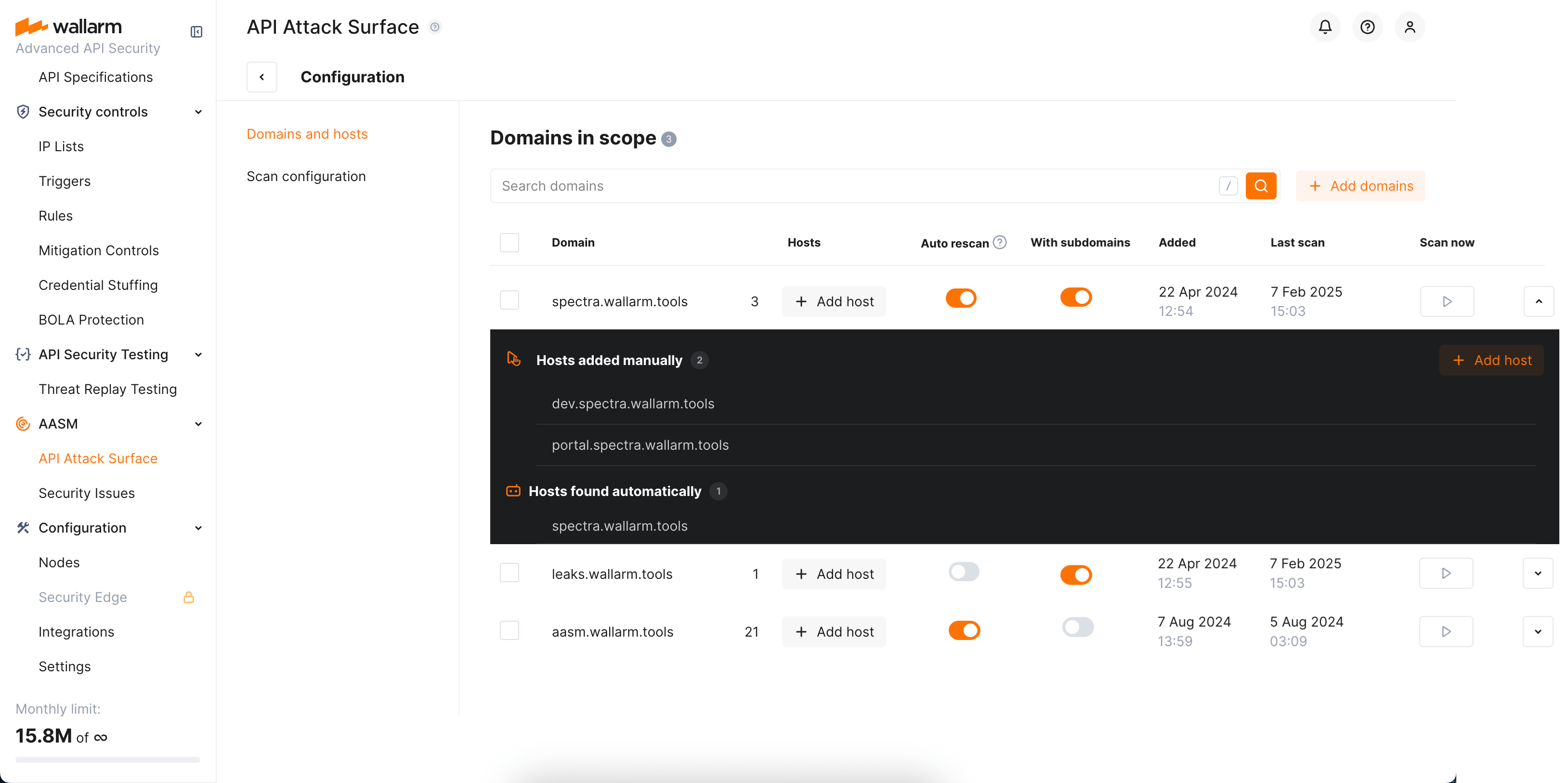 A brief information about when your domains were added to the scope and last scanned is presented at AASM → API Attack Surface → Configure → Domains and hosts.