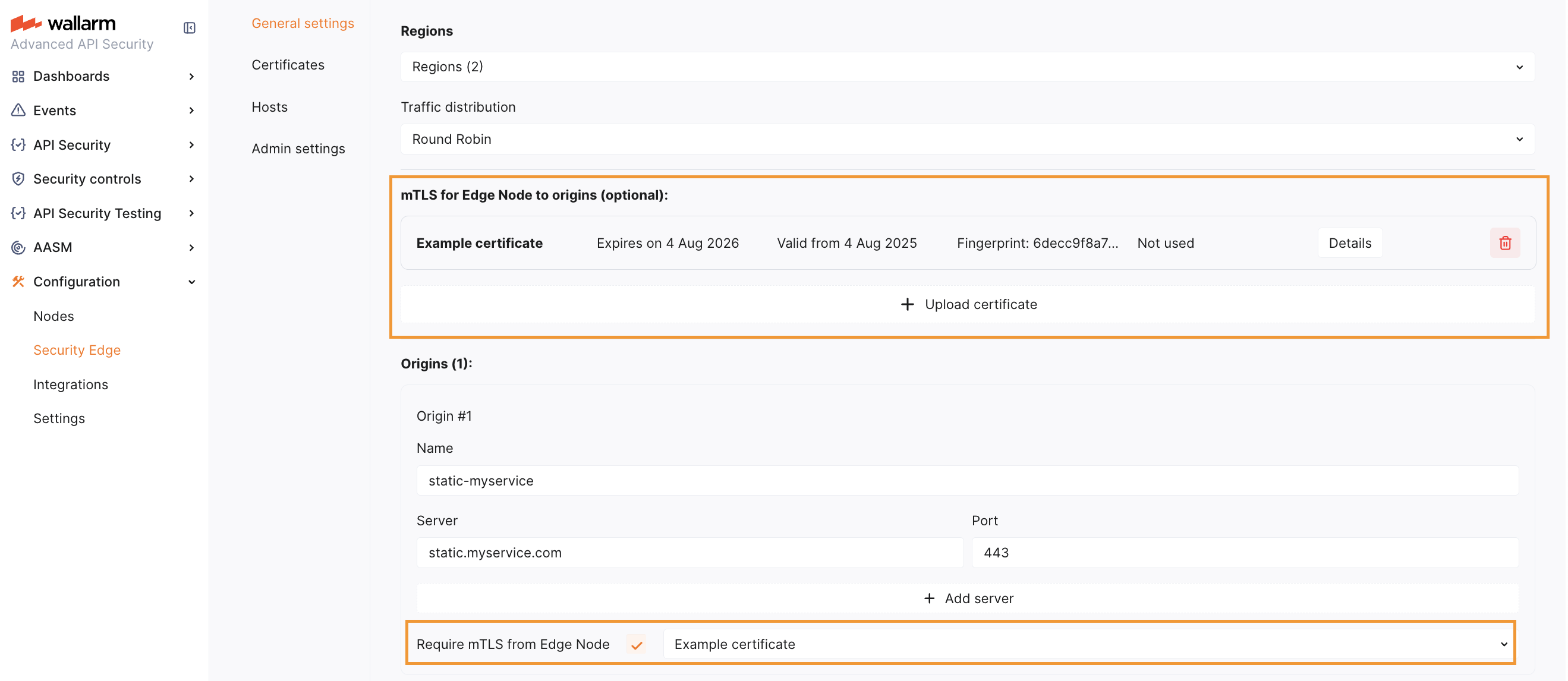 In Wallarm Console → Security Edge → Configure, under General settings, upload the certificate, private key, and CA bundle.