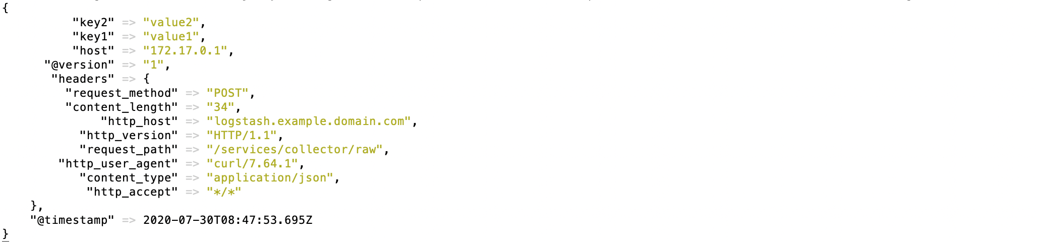 https://109.111.35.11:8088/services/collector/rawvia POST requests. To authorize requests, the HTTPS Event Collector token is used - Logstash logs are additionally printed on the command line (15th code line). The setting is used to verify that events are logged via Logstash