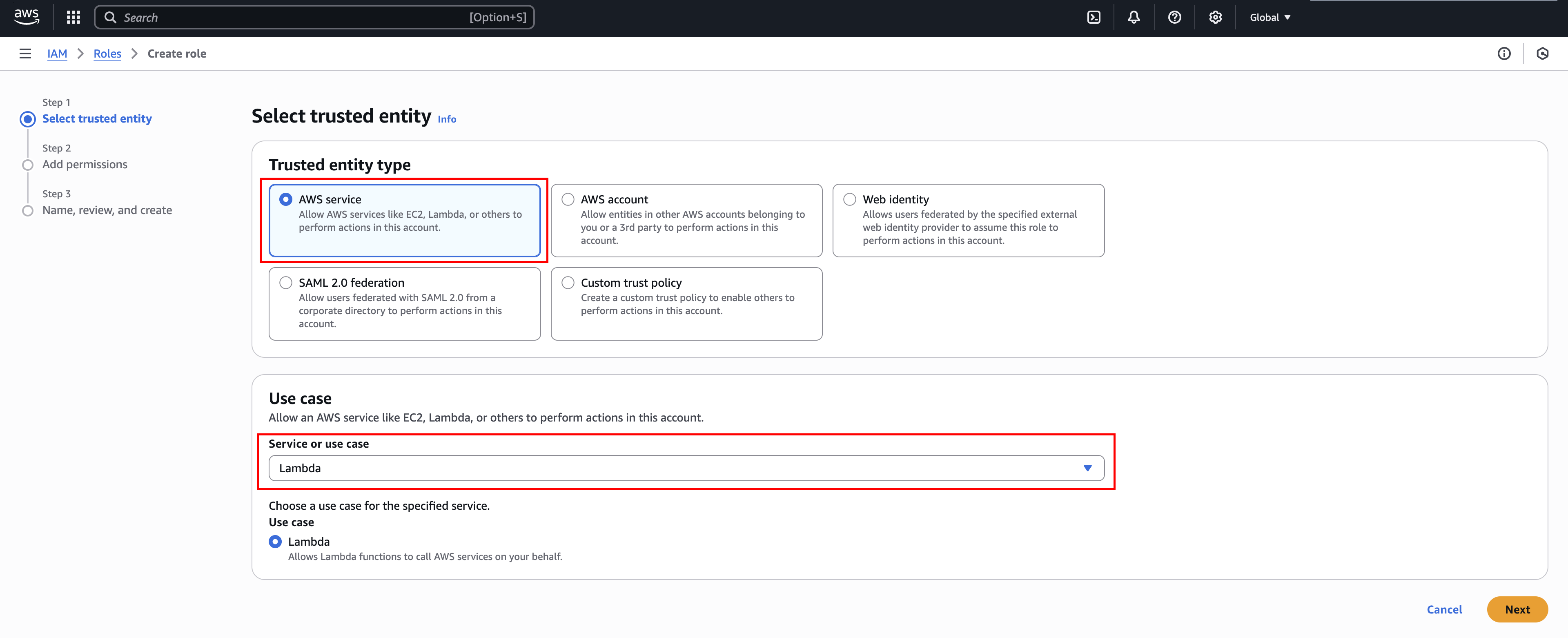 Select AWS service and Lambda for "Trusted entity type" and "Use case", respectively, and then click Next.